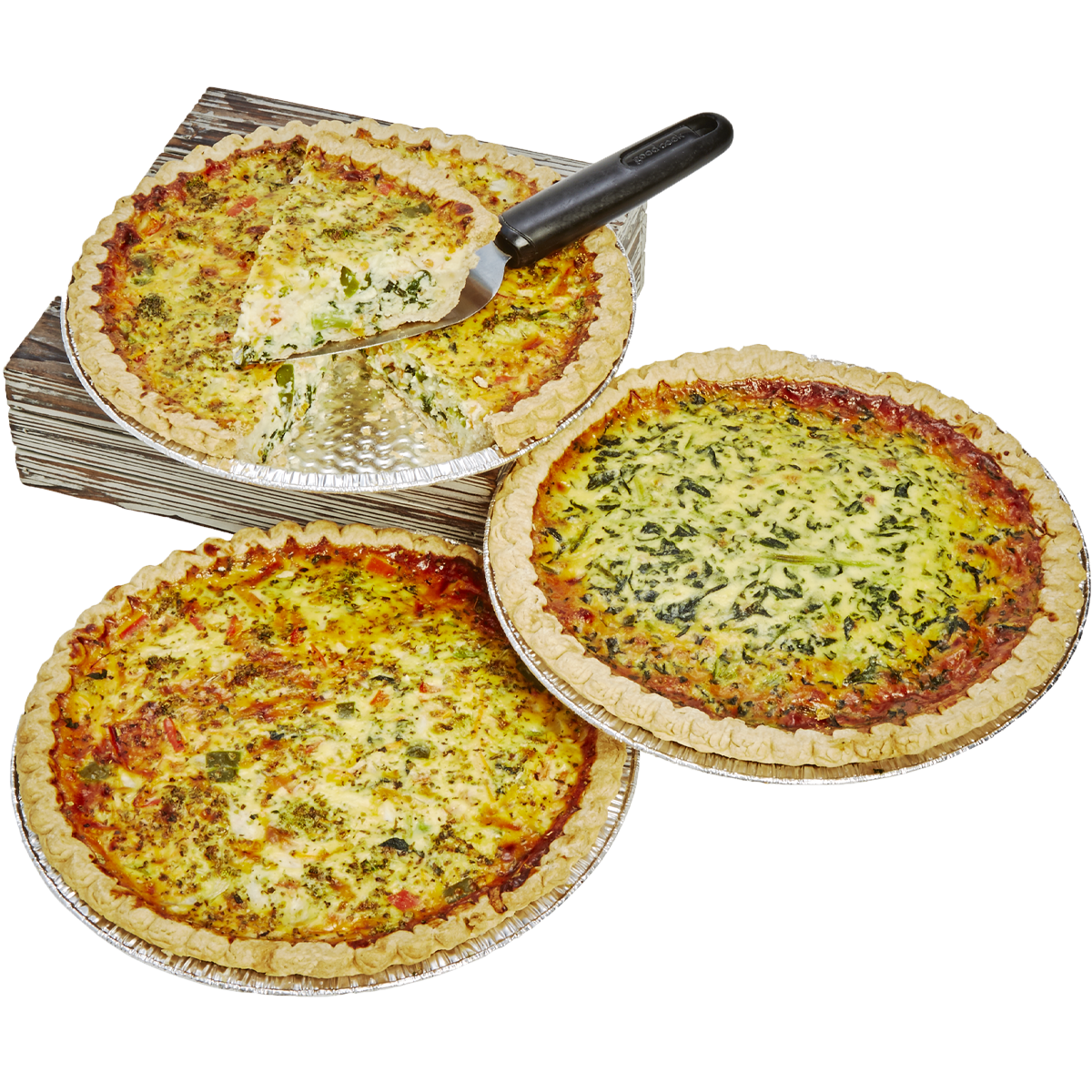 Loaded Veggie & Gouda Quiche, Lorraine Quiche, Shrimp & Crab Quiche, Spinach & Bacon Quiche