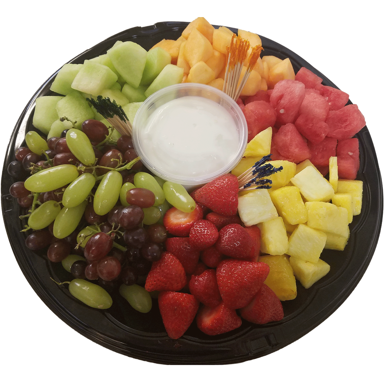 Includes Red & Green Grapes, Strawberries, Honeydew Melon, Cantaloupe, Watermelon & Pineapple with Yogurt Dip (may vary due to season availability)