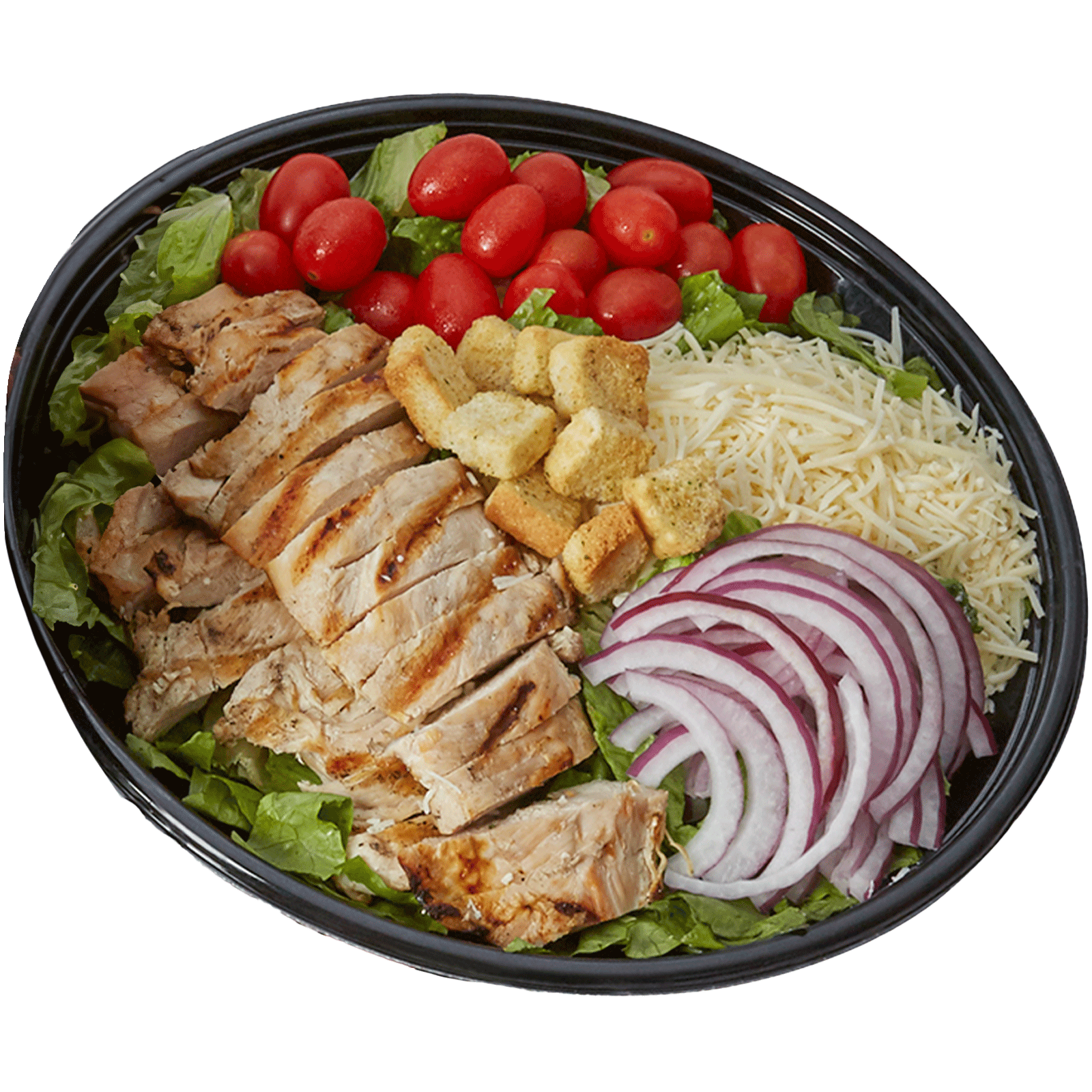 w/Caesar dressing, Romaine, Chicken, Red Onion, Tomatoes, Parmesan, Croutons