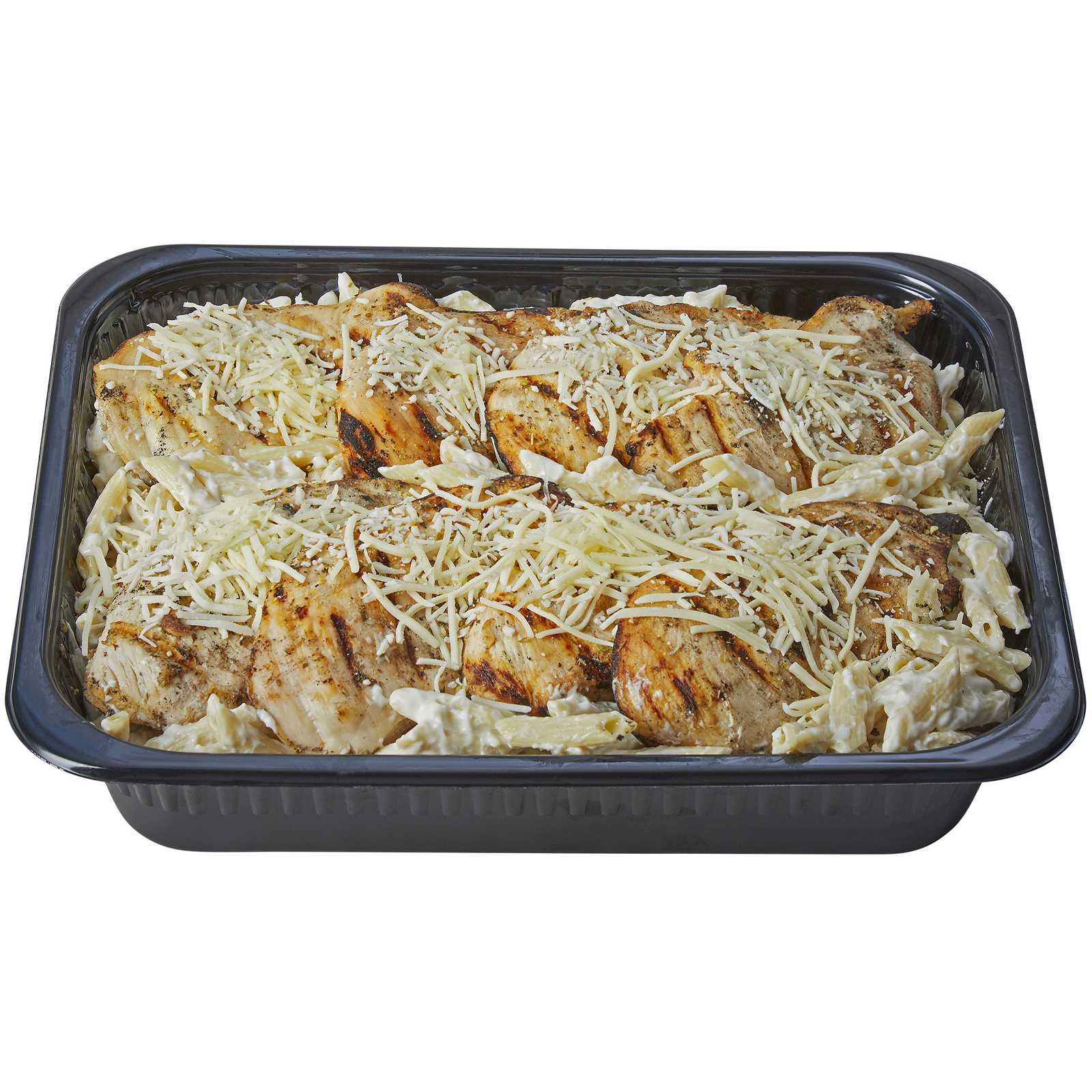 Serves 8 Perfectly seasoned grilled chicken breast served with penne pasta, tossed in creamy alfredo sauce and topped with shredded Parmesan cheese.