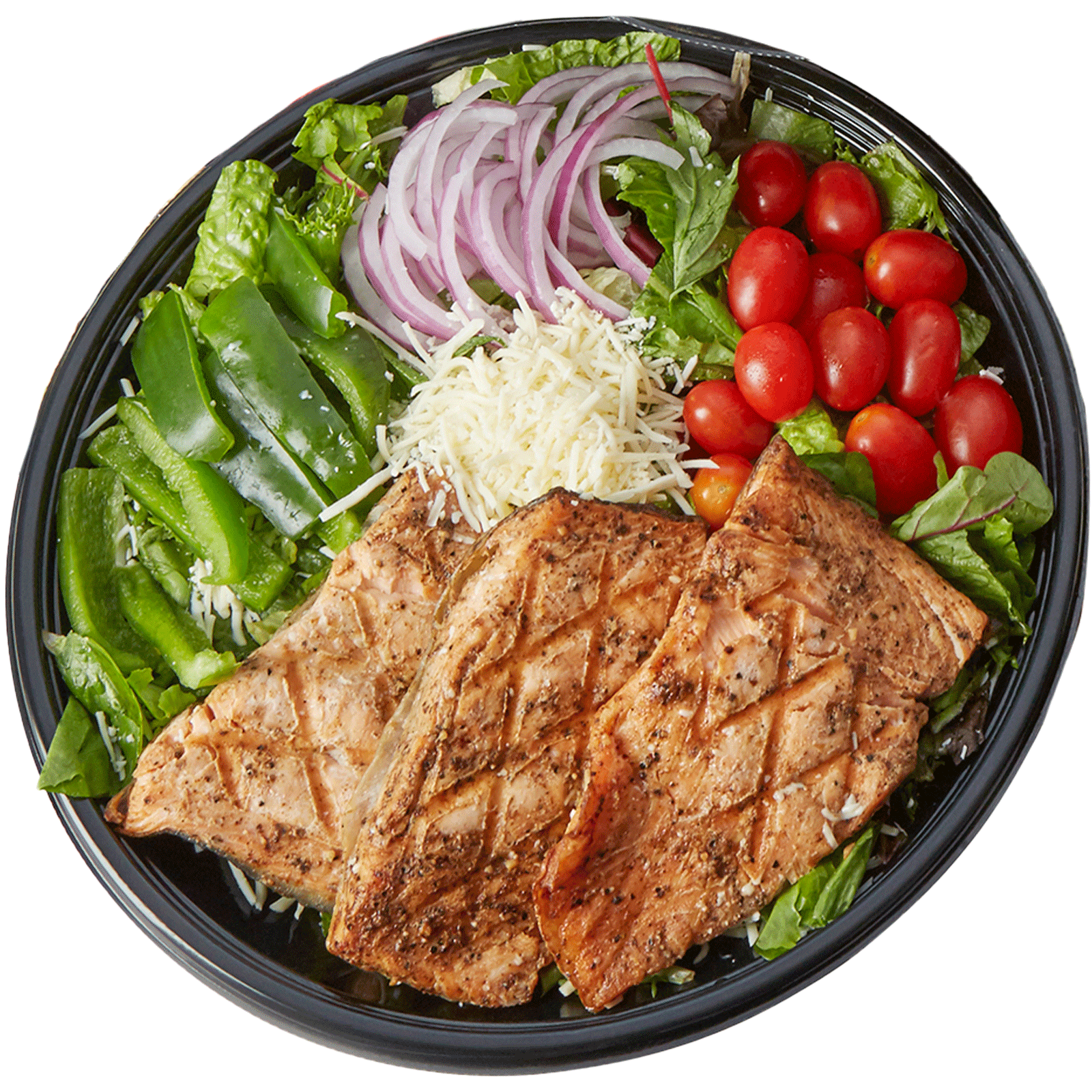 w/your choice of dressing, Romaine, Salmon, Red Onion, Tomatoes, Parmesan, Green Pepper