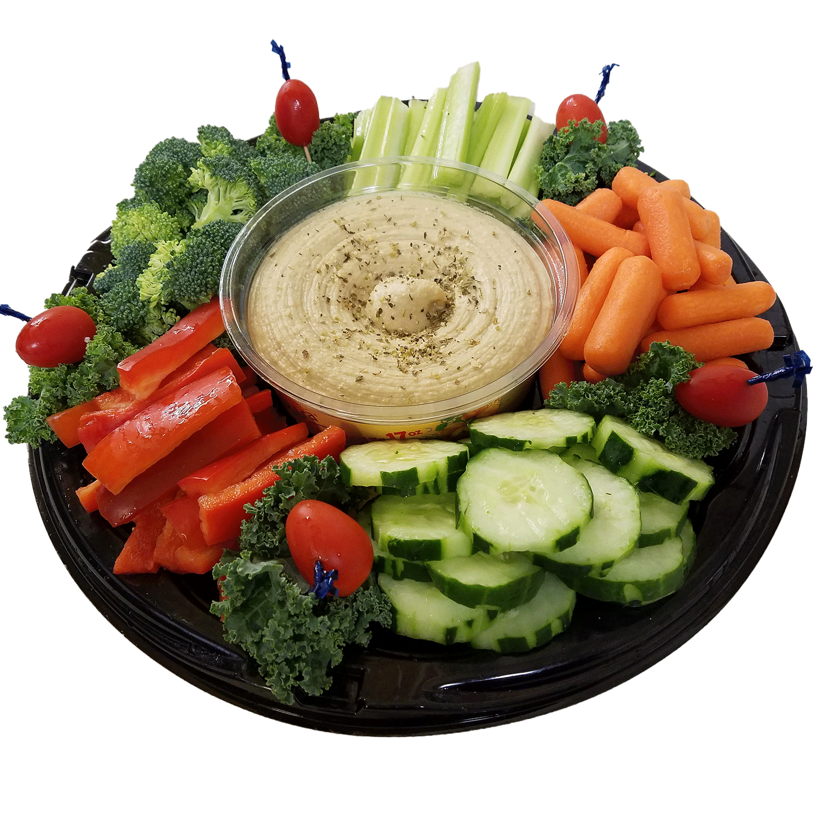 Includes Hummus, Cucumbers, Carrots, Broccoli, Red Pepper, Celery, Pita Chips