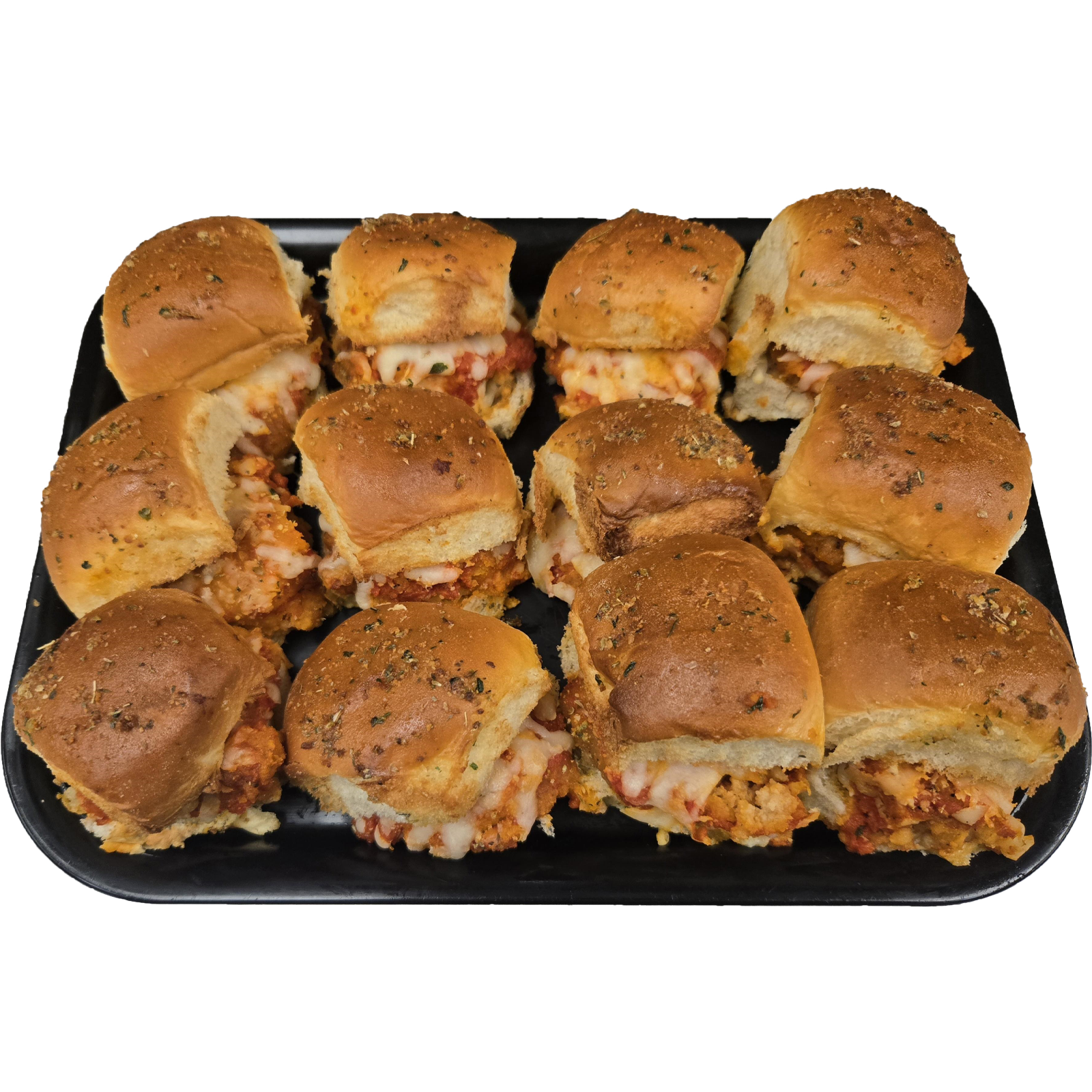 12 sliders made on King’s Hawaiian rolls are ready to be placed in the oven and warmed for your gathering. Choose from chicken Parmesan, chicken Chesapeake, Nashville hot chicken, meatballs with mozzarella cheese, ham and gouda cheese, turkey and havarti cheese, or pulled pork.