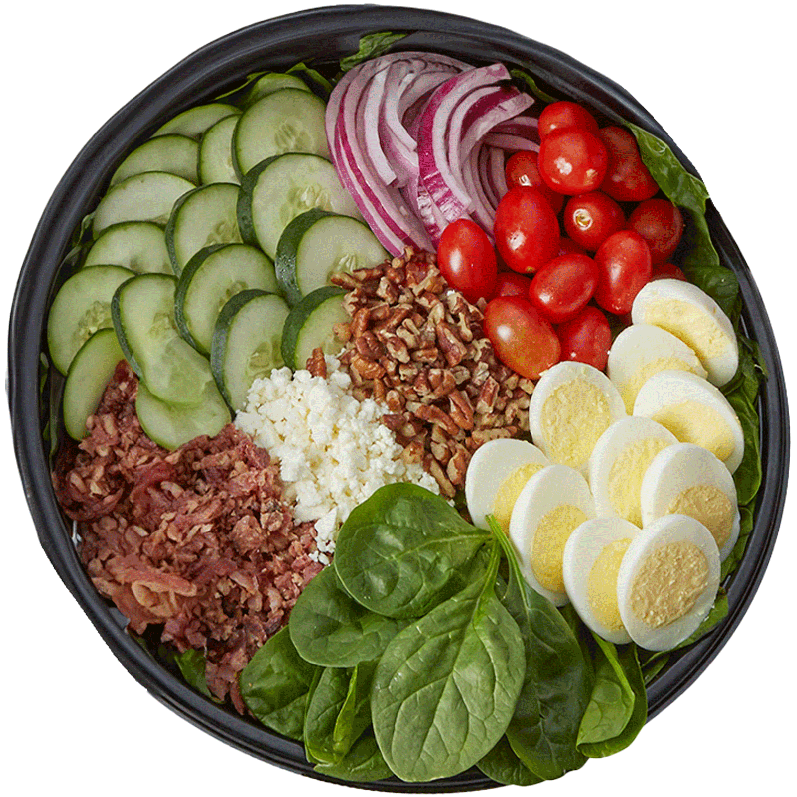 w/Honey Mustard dressing, Spinach, Eggs, Red Onion, Cucumber, Tomatoes, Feta, Bacon, Pecans