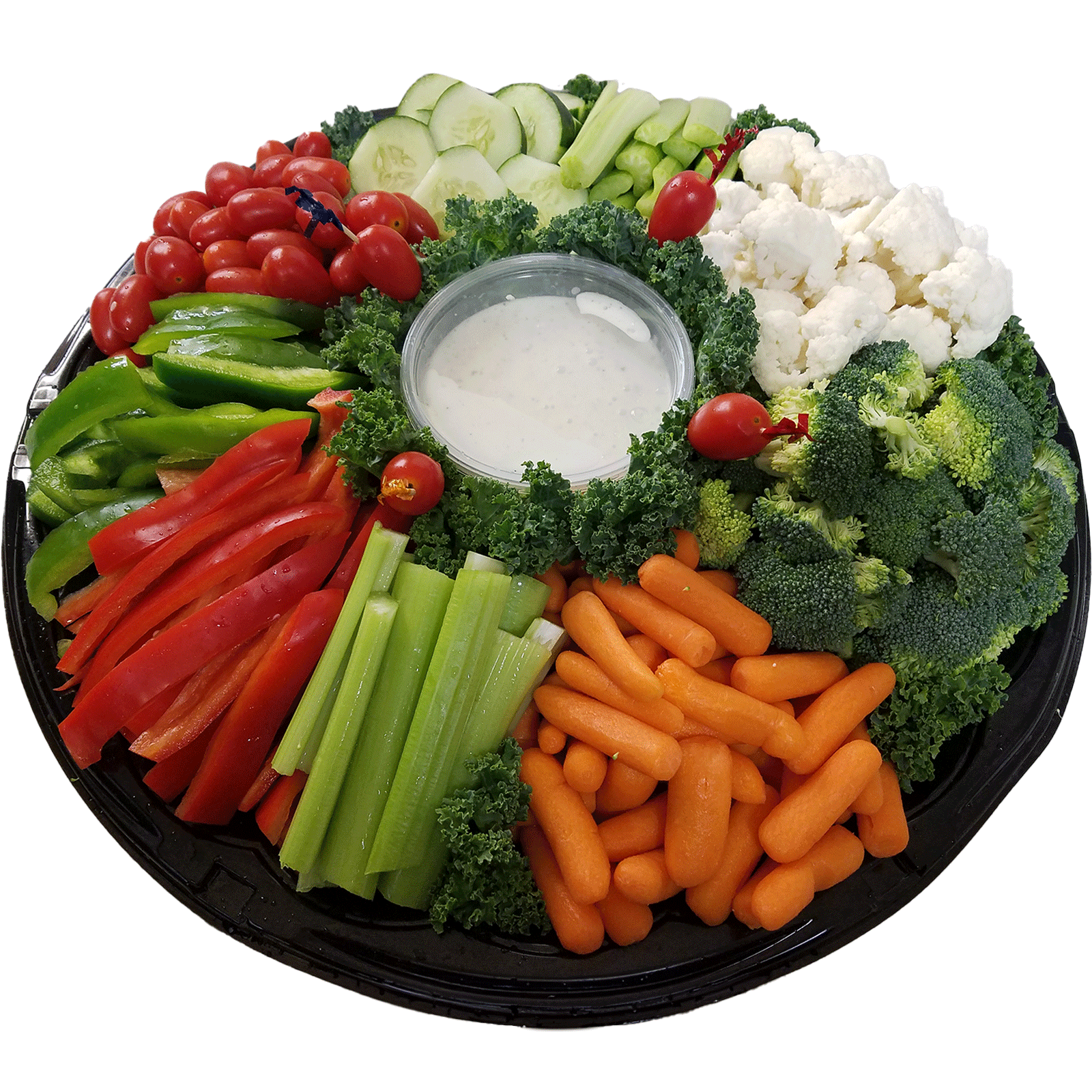 Includes Cucumbers, Baby Carrots, Broccoli, Cauliflower, Red & Green Pepper, Celery and Grape Tomatoes with Ranch Dip